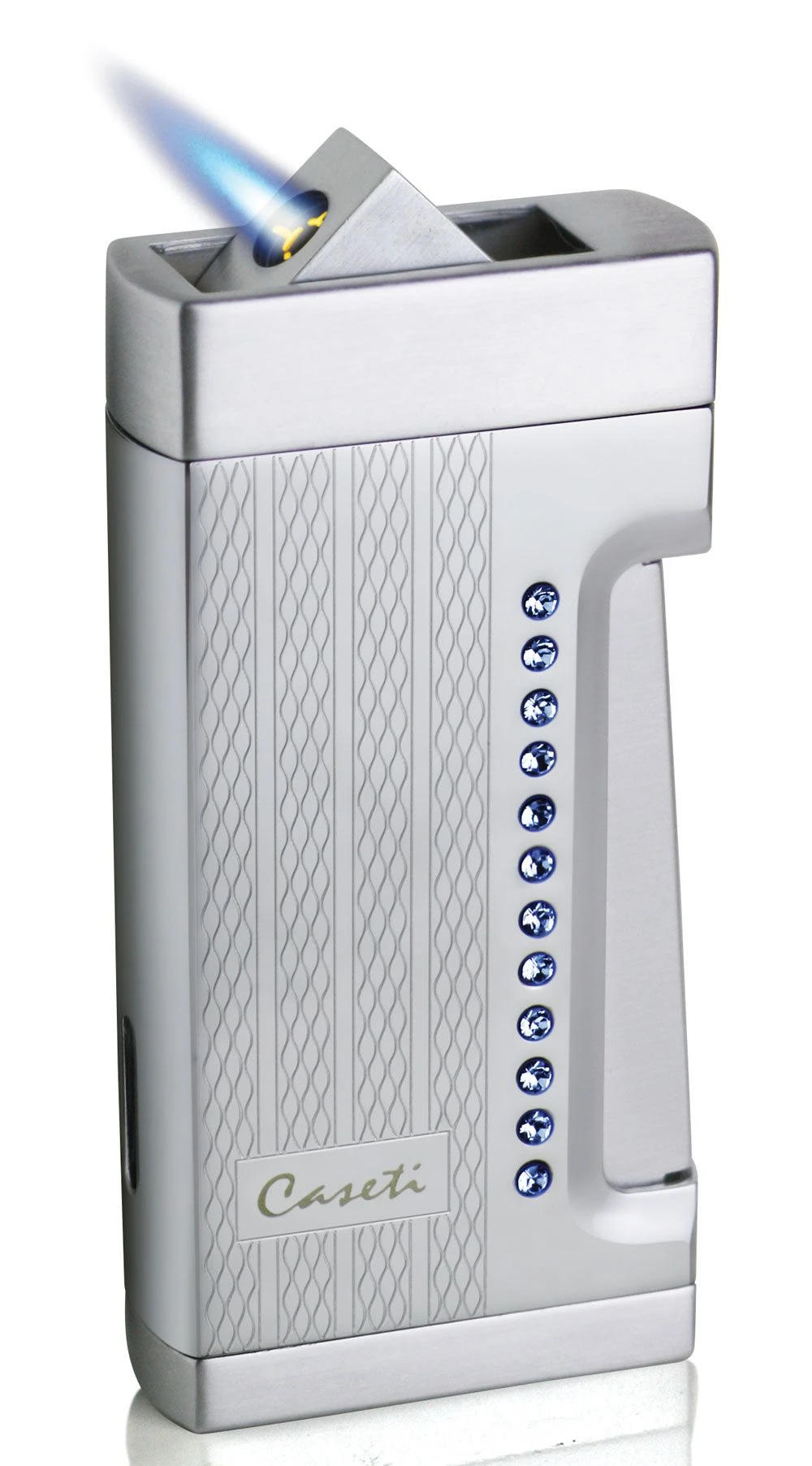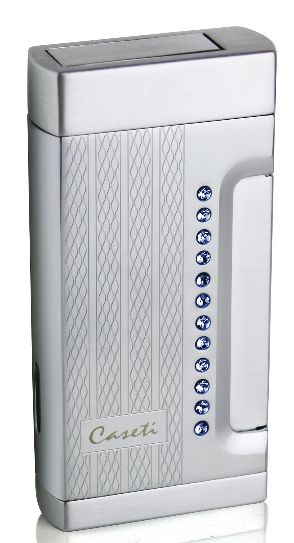 This Caseti Marvolo Single Jet Flame Cigar Lighter comes in a Engine Turn & Blue Crystal finish. Excellent for a range of occasions from anniversaries, to retirement gifts, this classy lighter is simply a must have. Single Jet Wind-Resistant Flame (Does Not Ignite Upside Down) and features a Single Action Ignition. Includes Butane Refillable Fuel Level Viewing Window on Side. Please note that this product comes shipped with empty butane fuel tank due to shipping regulation. Cross-Hatch Etching with Blue Crystals; Caseti Logo on Front Single Jet Wind-Resistant Flame (Does Not Ignite Upside Down); Single Action Ignition (Squeeze Side Ignition Button); Butane Refillable; Fuel Level Viewing Window on Side Approx. Dimensions: 2.63 inches (length) x 1.25 inches (width) x 0.50 inches (thickness); Approx. Weight: 0.20 pounds Includes Limited Manufacturer’s 2-Year Warranty and Lighter Instructions for Use Comes Packaged in Navy Blue Box with Navy Felt Pouch