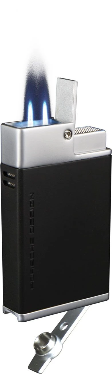 The Baden Double Torch Flame Lighter created by Porsche Design is a beautifully designed lighter with a powerful flame. The two wind-resistant jet flames are ignited when the single action trigger is pressed. With a unique Porsche Design logo featured on the fuel viewing window, you’ll always know when it’s time to refill with butane. The solid matte black body is accompanied with a sleek brushed silver color. Located at the bottom is a built-in 8mm cigar punch, along with a flame adjuster and butane refillable port. Purchase this today from eLighters and get it personalized with laser engraving! Matte Black Metal Body with Brushed Chrome Accents Double Wind-Resistant Jet Flame Lighter; Fuel Level Gauge on Back Dimensions: Length: 2.55 Inches, Width: 1.5 Inches, Height: 0.5 Inches; Weight: 3.4 Ounces Single Action Ignition; Single Motion Trigger On The Top Located at the Bottom – Flame Adjuster; Butane Refill; Built-in 8mm Cutter