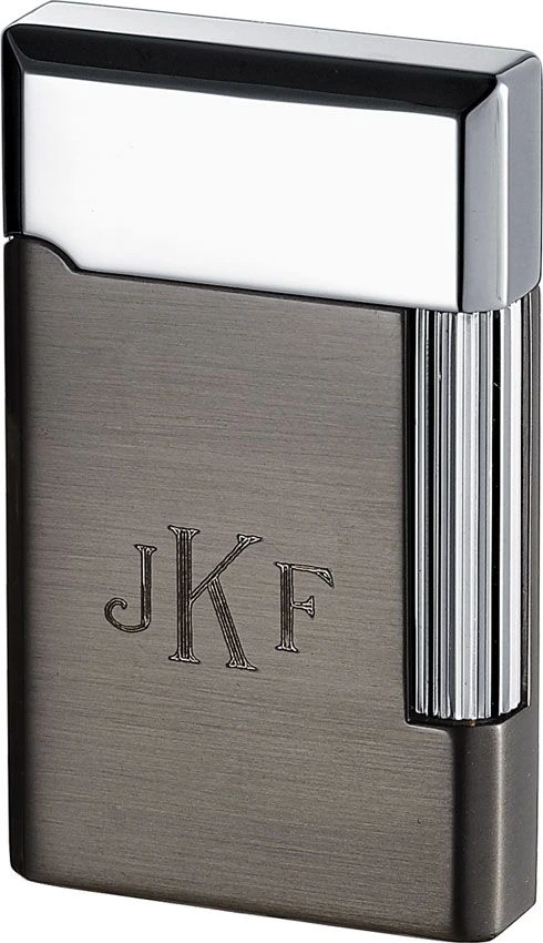 Clean, smooth lines create a simple yet elegant look for this Visol lighter. The dark gun metal finish on the Pyxis’s body is handsomely accented with polished chrome on its cap and the roller bar. This versatile lighter is a perfect addition to your accessories because it fits in any sort of environment, from a casual picnic to a formal wedding. Its compact metal body easily slips into a pocket so you can bring it along wherever you go. This durable lighter features a reliable flint ignition system to produce a bright, candle flame every time. Simply flip open the protective cap and twist the roller bar on its side to strike the flint and light a flame. The smooth surface of this butane refillable lighter is ideal for customizing so be sure to take advantage of our free engraving options when you order from eLighters today! Dimensions: 2.40″ (Height) x 1.46″ (Width) x 0.44″ (Thickness) Weight: 2.64 oz. Flint Lighter Butane Refillable Dual Action Ignition 1 Year Warranty Shipping Note : This lighter does not come filled with Butane. The engraved sample in the picture shown is engraved with “Roman Monogram” font for John F Kennedy (Initials entered were JKF).
