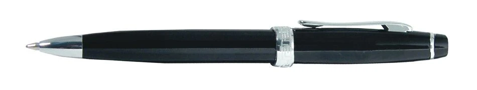 Featuring a solid brass body, this pen from Zippo has weighted feel that will set sit comfortably in your hand. A simple twist action opens this ballpoint pen for you so you can start writing quickly. This pen features a glossy black finish over chrome for a sophisticated look that is perfect for the office. Further adding to the look of this pen is the intricate detail found on its chrome band. This pen comes with a black ballpoint cartridge. Refills are available in black or blue.